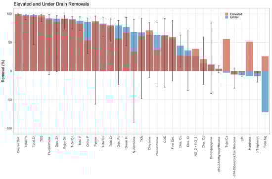 Median removal efficiencies for all analytes ordered from left to right by magnitude of removal at the under drain. Boot strapped confidence intervals for only under drain removals are shown. Only confidence intervals between −100% and 50% are shown.