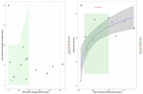 Effluent sample concentrations for TSS (A) and removal efficiencies for total P (B) at the under drain, versus mean IA surface concentrations (inflow) over storms. Light green regions represent bounding areas that define performance criteria for a stormwater BMP in order to meet the primary (TSS) and phosphorous treatment performance goals in the State of Washington. Storm events are represented by numbered dots.
