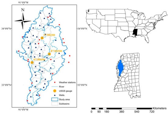 Groundwater levels are decreasing, and this is a serious problem in many regions of the United States, including Mississippi, where the predominant groundwater consumption is for agriculture irrigation. The Mississippi River alluvial plain in northwestern Mississippi (the Mississippi Delta) is one of the most important agricultural regions in the United States, with nearly 81% of the area being crops, including soybean, corn, cotton, and rice []. Over the past 30 years, this region has been facing increasingly declining trends in groundwater levels and storage due to the over-extraction of groundwater for agriculture irrigation []. Konikow [] reported that the aquifer system in the Mississippi Delta is one of the three largest used aquifers across the U.S., with an annual decline rate of 8.0 km3 per year. Due to the limited groundwater resources, surface water resources (SWR) may become supplementary irrigation sources for agriculture production. Thus, it is necessary to quantify the temporal and spatial variations of SWR in the Big Sunflower River Watershed (BSRW).