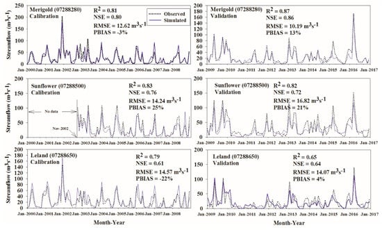 The model was calibrated from 2000 to 2008 and validated from 2009 to 2016 using USGS daily and monthly observed streamflow data at 3 gauge stations in our study region (Figure 1): Merigold (07288280), Sunflower (07288500), and Leland (07288500). Since streamflow is an important component of water balance, we calibrated and validated streamflow to assess the performance of the SWAT–MODFLOW model in BSRW. The model was also calibrated and validated using groundwater level data from 2000 and 2016. Each sub-basin has two wells, of which one was used for calibration and the other for validation.