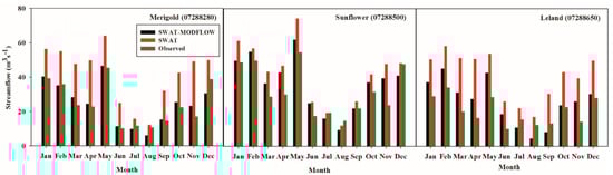 Comparison of simulated (by SWAT and SWAT-MODFLOW) and observed monthly averages of daily streamflow at three United States Geological Survey (USGS) gauge stations (Merigold 07288280, Sunflower 07288500, and Leland 07288500) in the Big Sunflower River Watershed (07288280, 07288500, and 07288500 represent the gauge station identification numbers).