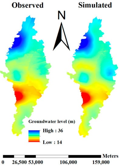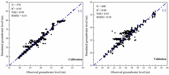 The calibration and validation results of groundwater levels within the 46 wells are presented in Figure 6, indicating that groundwater levels in our study region were well simulated by SWAT–MODFLOW based on the 1:1 line fitting diagram. R2 was 0.95 for calibration and 0.88 for validation, and NSE values were 0.99 and 0.93 for calibration and validation, respectively. The RMSE values for the calibration and validation periods was 0.51 and 0.59 m, demonstrating a good relationship between simulated and observed groundwater levels. The observed and simulated spatial distributions of groundwater levels averaged from April 2000 to October 2014 are displayed in Figure 7. Both the observed and simulated results showed a similar spatial distribution of groundwater levels in BSRW, ranging from 14 to 36 m. The groundwater levels were higher in the north of BSRW than in the south, since extensive irrigation amounts were used in the south where the groundwater storage loss has reached up to 1.8 × 108 m3 per year [,].