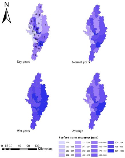Simulated surface water stress index and potential availability of surface water resources in each sub-basin during the dry years, normal years, and wet years.