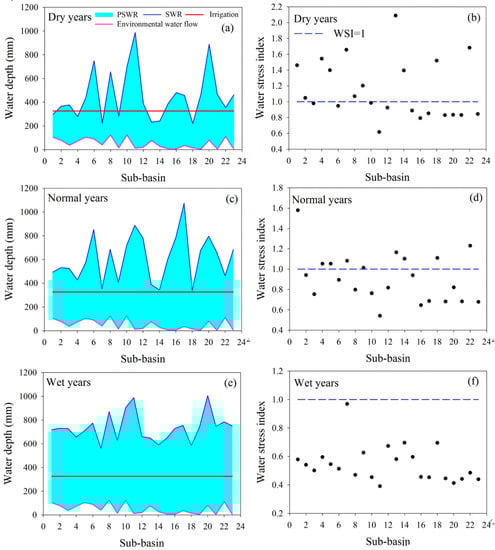 Figure 10 displayed averaged annual WSI and PSWR in each sub-basin in dry, normal, and wet years. WSI in most of the sub-basins was less than 1.0, ranging from 0.6 to 2.1 for dry years (Figure 10b), 0.5 to 1.6 for normal years (Figure 10d), and 0.4 to 1.0 for wet years (Figure 10f), indicating that annual PSWR was higher than annual surface water demand. Therefore, SWR has the potential to be used for irrigation without adverse impacts on the environment and ecosystems. Girolimetto and Venturini [] also estimated WSI in Oklahoma, USA, which has a similar climate as BSRW, and reported that the WSI in normal years ranged from 0.5 to 0.7. Kar and Kumar [] reported that WSI was between 0.61 and 0.63 before application of irrigation. Our results are comparable with those published results, indicating that WSI can be used in our study area for the assessment of surface water resources. Figure 10a,c,e showed that PSWR was higher than irrigation demand in most of the sub-basins in dry, normal, and wet years. The values of PSWR-irrigation ranged from −170 to 651 mm in dry years, −13 to 712 mm in normal years, and 196 to 651 mm in wet years, indicating that there was net SWR available for irrigation in BSRW. Groundwater scarcity has been a serious problem in BSRW, and agriculture irrigation in this region cannot depend only on groundwater resources for a long time. However, surface water resources might be a supplementary irrigation source to mitigate the water resources scarcity in this region.