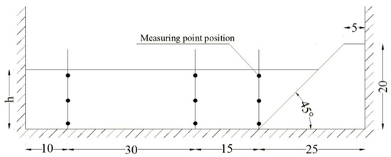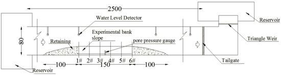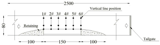 Gravel material was located upstream and downstream of the bank re-created to enable constant boundary conditions. Authors constructed in the laboratory a container with the dimensions of the banks to be replicated and fit it (once filled with material) within the flume for each experiment, guaranteeing the same position each time (±2 mm) by controlling reference points identified at the edge of the investigation area. Six sections (1#, 2#, 3#, 4#, 5#, and 6# as displayed in Figure 1) were identified within the bank to monitor the relevant parameters for this study. Four water level gauges were fitted in the flume to monitor the water level, and a pore water pressure gauge was embedded to monitor changes in the pore water pressure inside the bank as shown in Figure 2b. An example of constructed bank slope fitted within the experimental flume is shown in Figure 2a. For each experiment, velocities associated to each flow rate were measured at multiple locations within sections by using a propeller (accuracy 0.01 m/s), as represented in Figure 3, for the six sections illustrated in Figure 4. Water samples containing material were taken every three minutes at three monitoring section (1#, 3#, 5#) plus at the tailgate to measure the correspondent sediment concentration. A camera was set up on the side of the flume to record the whole process of bank slope collapse.