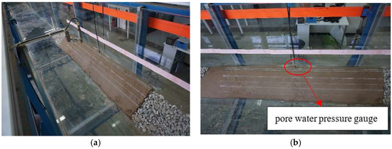 Scheme of the experimental model. (a) Constructed bank slope fitted within the experimental flume; (b) Position of the pore water pressure gauge embedded inside the bank.