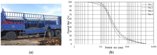 Real site and characteristics of the material. (a) Collection of the material on site; (b) Particle size distribution of the material collected.
