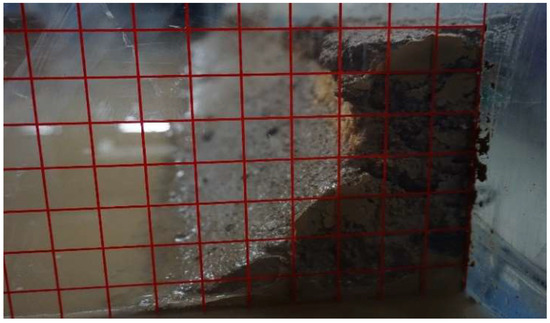 After each experiment, the amount of material collapsed was obtained by combining the volume associated with the topography of the riverbank before and after the entire process and calculating the difference. As previously stated, multiple measuring sections were selected every 20 cm in the direction of water flow to characterize the final riverbank shape, and for each step the full topography profile was measured by using a system of gridlines as shown in Figure 6. Finally, the coordinates obtained were entered into AutoCAD© [38] to recreate the profiles acquired and an example (first configuration, 45° slope) is shown in Figure 7.