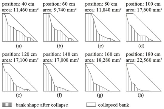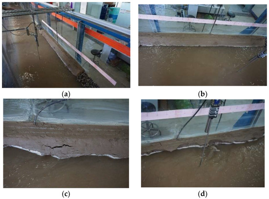 As the water continued to flow washing the bank, the groove became deeper and deeper but due to the strong bonding effect typical of the cohesive soil, the upper part of the bank affected by the groove was maintained suspended. When the gravity of the suspended soil was then greater than its anti-sliding force and exceeded its stable slope, multiple cracks appeared on the bank, as shown in Figure 8b. The magnitude of these cracks deepened with the time and eventually the collapse occurred on the bank causing the removal of partial blocks as shown in Figure 8c. Finally, in the case in which the bank slope was steep, its collapse surface was recorded to be almost vertical, as shown in Figure 8d, which is in agreement with the natural phenomenon observed in the Dengkou river section [37].