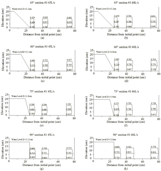 Velocity distribution of section #3 under different flow conditions (45 L/s and 60 L/s) and slope angles (45°, 60°, 75°, and 90°) (Unit: m/s). (a) 45° section #3 45 L/s; (b) 45° section #3 60 L/s; (c) 60° section #3 45 L/s; (d) 60° section #3 60 L/s; (e) 75° section #3 45 L/s; (f) 75° section #3 60 L/s; (g) 90° section #3 45 L/s; (h) 90° section #3 60 L/s.
