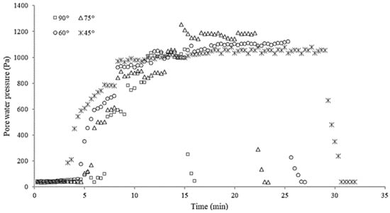 Pore water pressure measured under the flow rate of 45 L/s for each slope angle (45°, 60°, 75°, and 90°).