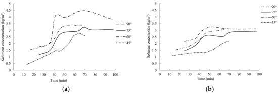 By comparing the sediment concentration recorded in Section #3 for each slope configuration of 45°, 60°, 75°, and 90°, it is possible to notice a consistent trend regardless of the different initial slope (Figure 11a). At the beginning, for each configuration, the sediment concentration increases slowly, and then rises dramatically. The rapid increase in sediment concentration corresponds with the moment when the bank slope collapses. When this phenomenon happens, a large amount of debris enters the river, mixes with the water, increasing its sediment concentration that reaches its maximum level within the stream. When the water continues to flow towards the downstream section, the sediment concentration recorded gradually decreases and becomes stable (Figure 11b). For the tests recorded, the time measured to reach the collapse and hence the highest sediment concentration in the river is between 35 and 45 min. Furthermore, it has been noticed that highest is the slope and faster is this process.