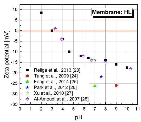 Dependence of zeta potential of the HL membrane on pH of the medium presented by different authors; [23] - Zeta potential of the membrane surface was determined by streaming potential, 1 mM KCl; [24] - Zeta potentials of the membrane were determined from streaming potential measurements in a background electrolyte of 10 mM NaCl; [25] - Zeta potential of the membrane was determined at pH 7.0 and 25 °C in a 1 mM/L KCl solution, using streaming potential equipment; [26] - Zeta potential of the membrane was determined at pH 7.0 and 25 °C in a 1 mM/L KCl solution, using streaming potential equipment; [27] - Zeta potential measured at pH 7 in 10 mM KCl solution.
