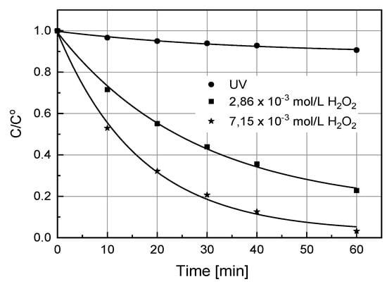 A 30% solution of hydrogen peroxide was used in the oxidation with UV/H2O2. To 3700 mL of the solution, 1.2 mL of H2O2 was added (which constituted a molar concentration of 2.86 × 10−3 mol/L).
