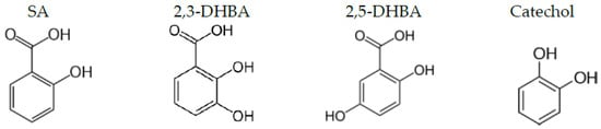 Salicylic acid (SA) is characterized by high reaction rate with OH radical (5 × 109 M−1 s−1). Reaction products are stable, which makes it possible to perform their qualitative analysis easily [14]. Main products resulting from the reaction of salicylic acid with hydroxyl radicals are 2,3-dihydroxybenzoic acid (2,3-DHBA), 2,5-dihydroxybenzoic acid (2,5-DHBA), and catechol [9,15]. Karnik [15] successfully determined two products of the oxidation of salicylic acid with ozone, that is, 2,3-DHBA and 2,5-DHBA, with 2,3-DHBA being the dominant reaction product. Chen et al. [9] obtained a similar result in the process of salicylic acid oxidation with Fenton reagent and UV/H2O2. The main product was 2,3-DHBA, while 2,5-DHBA and catechol were produced in small amounts.