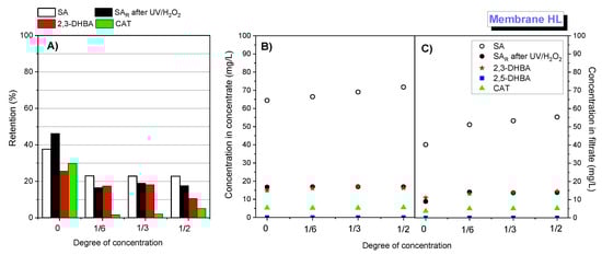 (A) Dependence of retention on the degree of initial bath concentration; (B) dependence of concentration of salicylic acid and products of its oxidation in the concentrate on the degree of initial bath concentration; (C) dependence of concentration of salicylic acid and products of its oxidation in the filtrate on the degree of initial bath concentration; HL membrane, pressure 1.0 MPa, temperature 30 °C. Abbreviations: SA- salicylic acid; 2,3-DHBA- 2,3-dihydroxybenzoic acid; 2,5-DHBA- 2,5-dihydroxybenzoic acid; CAT- catechol; SAR-residual salicylic acid after UV/H2O2.