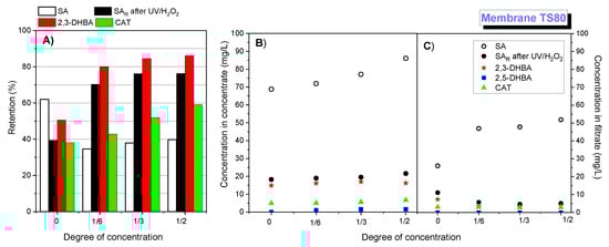 (A) Dependence of retention on the degree of initial bath concentration; (B) dependence of concentration of salicylic acid and products of its oxidation in the concentrate on the degree of initial bath concentration; (C) dependence of the concentration of salicylic acid and products of its oxidation in the filtrate on the degree of initial bath concentration; TS80 membrane, pressure 1.0 MPa, temperature 30 °C. Abbreviations: SA- salicylic acid; 2,3-DHBA- 2,3-dihydroxybenzoic acid; 2,5-DHBA- 2,5-dihydroxybenzoic acid; CAT- catechol; SAR-residual salicylic acid after UV/H2O2.