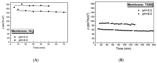 Dependence of filtrate flux on the filtration time: (A) for HL membrane; (B) for TS80 membrane; pressure 1.0 MPa, temperature 30 °C.