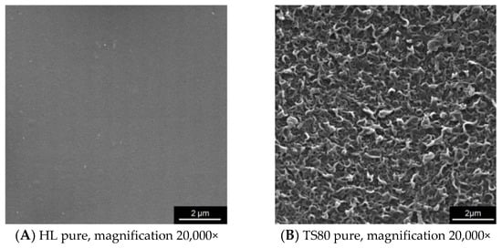 SEM microscopic images of selected membranes at 20,000×: (A) HL pure, magnification 20,000×; (B) TS80 pure, magnification 20,000×.