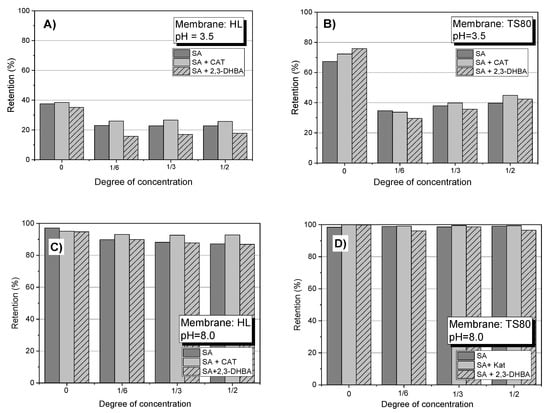 In the case of the TS80 membrane, the negative effect of 2,3-DHBA is visible only in the first stage of the process (Figure 8B). In the final stage, with a concentration of 1:2, the presence of both oxidation products improved SA retention coefficients. This may be due to the fact that in the initial stage, the adsorption process dominates, while during the concentration, the separation through spatial blocking and electrostatic repulsion becomes dominant. In the case of TS80 membrane, at pH 3, the membrane surface is charged negatively (ca. −20 mV, measurement with 10mM KCl, [45]), and consequently, the effect of electrostatic interaction should be taken into account. The results are consistent with Figure 5. During concentrate concentration, higher SA retention coefficients were obtained compared to pure SA solution.