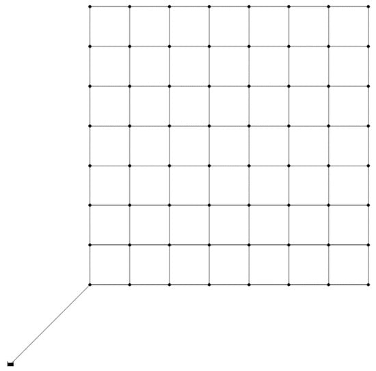 The Grid-1 network was first proposed by Jung et al. [], and comprised a 5 × 5 network; however, in this study, the network size was increased to 7 × 7 for multiple pipe failure modeling. The network contained 49 closed loops, one reservoir, 64 demand nodes, and 113 pipes. The Hazen–Williams roughness coefficient was 120 for all pipes, and the minimum required pressure was 28.1 m (40 psi) under peak demand conditions. The network layout is shown in Figure 1; the diameter of each pipe was one of the 16 available commercial pipe sizes (50, 100, 200, 300, 400, 500, 600, 700, 800, 900, 1000, 1200, 1400, 1600, 1800, and 2000 mm), or no pipe was determined. Table 1 lists the pipe CC parameters used in Equation (3), which were determined based on the pipe materials and buried soil conditions described by Clark et al. [].