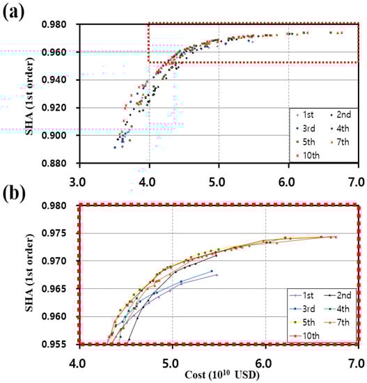 Figure 2a shows the multi-objective optimal design for multiple failures. First, the Pareto-optimal solutions indicated that the SHA of the bulk of the designs increased with CC from 3.5 × 104 to 4.5 × 104 million USD. The increased SHA value of 5.0 × 104 million USD was determined to be the marginal cost. Figure 2b shows an enlarged view of the distribution of solutions around the marginal cost. In this Pareto solution, designs including the fourth-order failure greater could yield a SHA of approximately 0.970–0.975; however, for failures below the fourth order, the SHA was 0.970. These results show that optimal designs up to the third-order failure have limitations when deriving a hydraulically stable design, even if the CC is greater than the marginal cost.