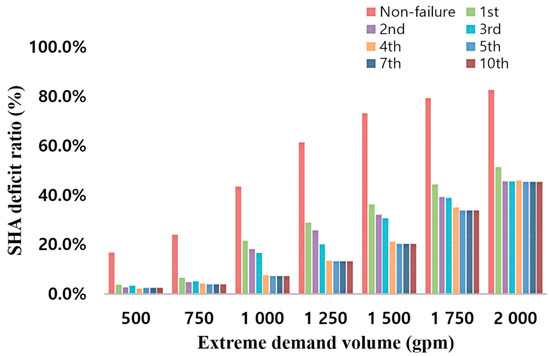 The gray shading in Table 5 shows the relatively small SHA deficit ratios when various demand volumes were applied to the selected design. When the demand volumes applied to the Grid-1 network were 0.032–0.047 (7.5–11.3%) and 0.111–0.126 (26.3–30.0%) cms, the SHA deficit ratios were approximately the same for respective failure orders. This result demonstrates the importance of selecting appropriate demand volumes, because the application of a demand volume that is too small or too large hinders accurate evaluation of design performance under extreme demand conditions. Therefore, volumes of 0.063–0.079 cms (15.0–22.5%) should be used to achieve effective simulation.