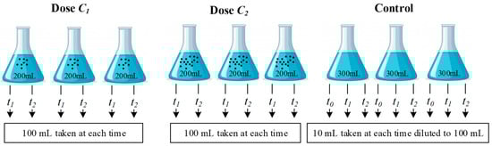 For each bacterium, a stock solution was prepared by taking a full loop of colonies from the strain and cultivated in 100 mL nutrient broth for 24 h at 37 °C. Then, 0.8 mL of the stock solution was taken and diluted in a 1-L sterilized water sample. Further dilution was done by taking 0.1 mL from the diluted water and adding it to a 2.7 L of a sterilized water sample. This diluted water sample was shaken well to homogenize the solution, and the content was distributed among nine sterilized beakers. Six of these beakers were filled with 200 mL each. Another three beakers were filled with 300 mL each and served as controls (i.e., without addition of NPs). The six 200-mL beakers were divided into two sets; each set received a different dose of NPs. A schematic diagram of the antibacterial assessment procedure for a certain microorganism, NP, and water type is shown in Figure 1.