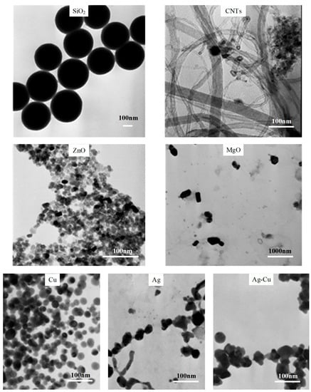 In this study, a chemical co-precipitation method was used to synthesize the NPs. The particles were stabilized by adding a stabilizing agent to prevent the NPs from aggregation. The size of the NPs was controlled by varying the pH, synthesis temperature, solvent type, and type of reducing agent [,]. The following seven types of NPs were selected: silver, silver-copper, copper, silicon dioxide, magnesium oxide, zinc oxide NPs, and carbon nanotubes. The Sonicafier 450 (Branson Ultrasonic Corporation, Danbury, CT, USA) was used for the sonication step in many of the prepared NPs. Sufficient quantities of the investigated NPs were prepared once and utilized in the conducted experiments. The preparation of these particles is described below.