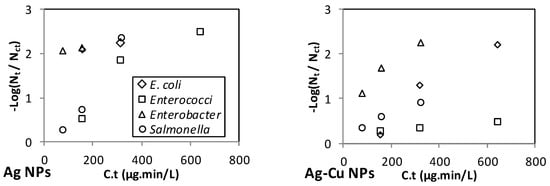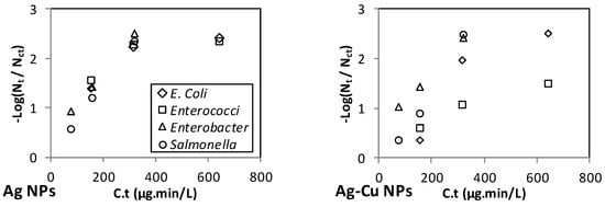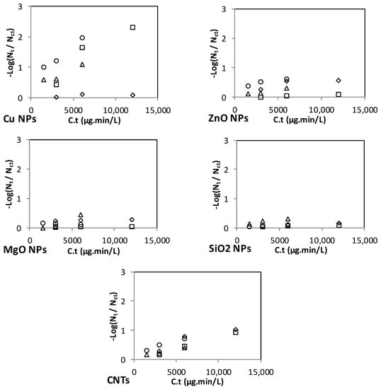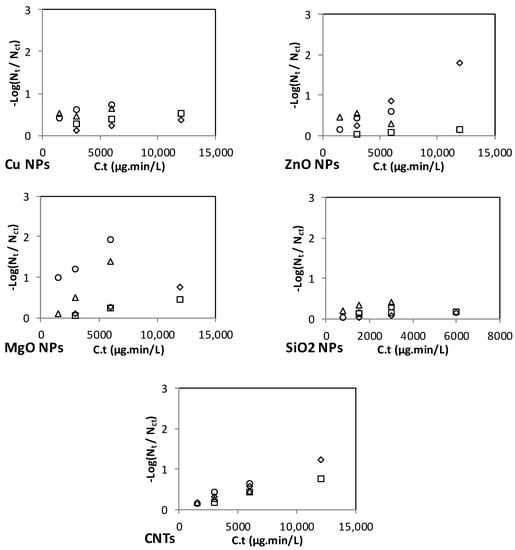 The range of C.t values varies among the NPs (Figure 3 and Figure 4), with Ag and Ag-Cu having the lowest range (up to 640 μg·min/L), and ZnO, MgO, SiO2, and CNT NPs having the highest range (up to 12,000 μg·min/L). Although the ranges of the C.t values for Ag and Ag-Cu NPs were the lowest, Ag and Ag-Cu NPs were found to be the strongest disinfectants.