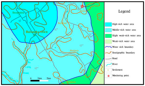 The study was conducted in the southern margin of the Mu Us Sandy Land, Bulanghe Township, Yulin City, China (Figure 1). It is located in the water shed of Bu Lang River, a tributary of Hai Liu Tu River. The surface layer in this area is aeolian sand, underlying sandstone or mudstone, and the main aquifer is the Quaternary Lake sediments’ pore aquifer (), a middle-rich water area (Figure 2). Soils are fine-textured sand without clay, according to the grain size composition experiment at the test site (Table 1). The depth of phreatic water is about 1.1–1.4 m. Altitude is 1250–1280 m and the average annual temperature is 8.1 °C. It experiences a typical semi-arid climate: precipitation is mainly concentrated from June to September, with an average annual precipitation of 340 mm and an average annual potential evaporation of 2180 mm from 1957–2007 [38].