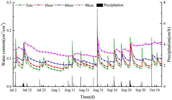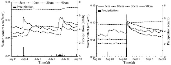 Modeled soil water content following each measured precipitation time-series during the forecast period. The variations of water content after precipitation were much more sensitive than the field measurement data in Figure 4, especially at 5 cm.