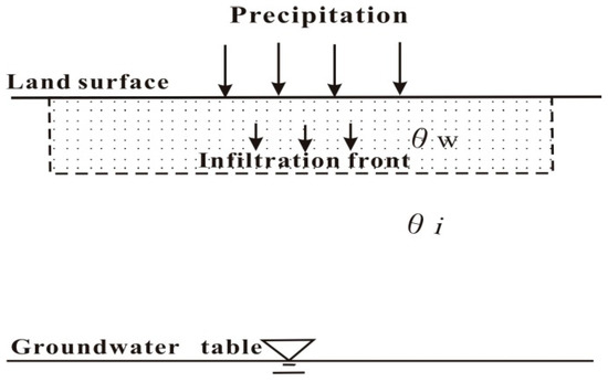 Over 2500 h of observed data of water content and water table (from 2 July to 15 October 2014) were analyzed in this paper. The shallower the depth of the vadose zone was, the quicker the water content increased after precipitation. The greater precipitation was, the deeper the response depth of the vadose zone. For example (Figure 4), on 27 August 2014, the precipitation was 0.82 cm (small rain). There was a response at a 5 cm depth, with no obvious change at greater depths. Precipitation on 30 August was 7.1 cm (rainstorm), the water content at all depths of the vadose zone increased significantly. The infiltration process is illustrated in Figure 5, where is the water content upon the infiltration front, often near the field capacity, is the initial water content in the vadose zone, the dotted lines are the infiltration fronts. During our study period, infiltration was totally non-ponding, as the rain intensity was usually less than the infiltrability. The unsaturated flow moved downwards with time, driven by gravity and capillary force. Water content was still below the infiltration front while water content increased heavily above that front. The infiltration would keep moving and may eventually reach the water table if the water supply at surface was sufficient.