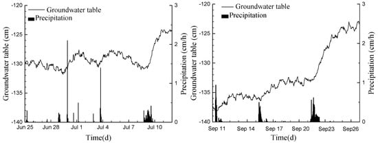 Precipitation in this area is mainly concentrated in the wet season (June–September), accounting for 80–90% of the annual precipitation. A total 5211 h of a free-freezing period from March to October was selected as a research period. The groundwater recharge was calculated by accumulative water flux near the water table during a recharge period. Water table depth varied from about 1.2 m to 1.4 m throughout a hydrological year.
