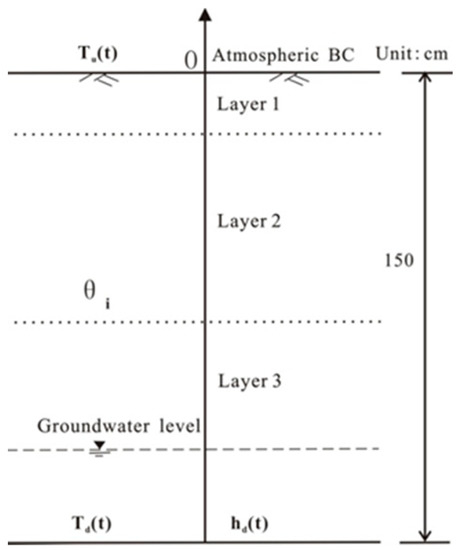 To better understand the lag effects in precipitation infiltration and remove the influence of preferential flow on infiltration and to determine recharge lag time accurately, a numerical model water, vapor, and heat in the variably-saturated zone based on Hydrus-1D software was established in this report. The soil surface was selected as the origin of the coordinates and the upward direction was positive. The conceptual model of hydrogeology is shown in Figure 7. Soil surface is the upper boundary of the model. On this boundary, precipitation infiltrates and soil water evaporate; heat exchange takes place between the soil and the atmosphere. The sand modeled column extended to a depth of 150 cm (about 30 cm under the water table). The total column contained three layers based on particle analysis and bulk density, 0–20 cm was the first layer, 20–80 cm the second one, and 80–150 cm the third. The pressure head at the lower boundary varies with the change of water table, ignoring horizontal diffusion, which can be regarded as a one-dimensional vertical transient flow model of a “variably saturated zone”. In the figure, is the temperature of lower boundary, for the upper boundary, is the pressure head at the lower boundary; is the profile water content distribution at initial time. The media can be classified into three layers according to the particle analysis and the bulk density, 0–20 cm is the first layer, 20–80 cm is the second one, and 80–150 cm the third one.
