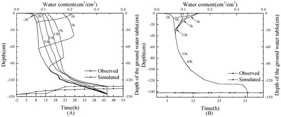 A recharge front was defined as the interface between the rising zone and the unchanged zone of water content, above which water content rose and below which water content remain unchanged. During the infiltration process, the recharge front moved to 15 cm in 1 h, 65 cm in 3 h, and 95 cm in 7 h. The maximum moving rate of the recharge front appeared in 0–3 h, corresponding to the maximum rainfall intensity (2 h after the start of precipitation). The deep vadose zone (near the water table) was within the capillary saturated zone, so water content variation was quite small. With the increase of water content in the entire vadose zone, infiltration reached the water table. Figure 9A shows that the observed time of water table rising (3 h) was significantly earlier than the model result (13 h), and the amplitude was also smaller. Water content in the entire vadose zone approximately returned to the pre-rain distribution after 53 h, indicating the influence of this rain tended to disappear.