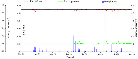 The solid-green line in Figure 10 is the groundwater recharge rate (GRR). The red-dotted line is the water flux at the depth of 40 cm (F) in the vadose zone; a negative value indicates the downward direction. The positive F was quite small in the research period, indicating that the water flux at this depth was very weak. Before June, GRR remained 0 though the total precipitation was 121 mm. The groundwater recharge was mainly concentrated in the period from July to September. In this period, the total recharge accounted for over 90% of the annual recharge, reaching 268 mm. The peaks of F were consistent with the peaks of precipitation, but with a slight lag about 5–10 h. The GRR, smaller than F, also lagged behind F. The difference between GRR and F became greater after a storm rain than a heavy rain. For example, after the storm rain (total 71.6 mm) on 29 August, the peak value of F was −1.5 cm/h, and the peak value of GRR was only 0.2 cm/h. Due to the obvious wet and dry interface at the upper layer during infiltration, leading to a larger hydraulic gradient, the flux of the upper layer was quite higher than GRR.