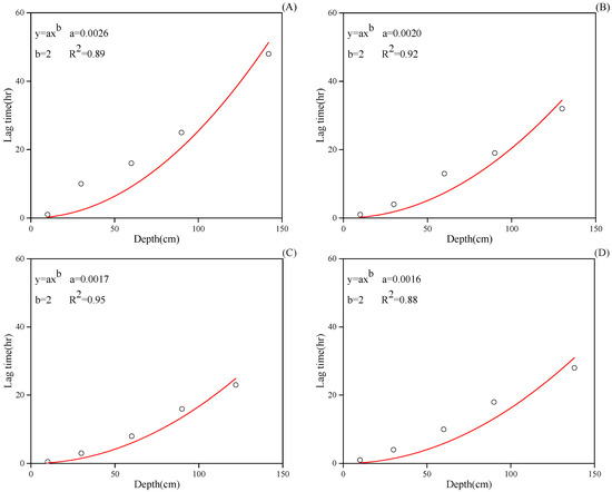 Figure 11 shows relationships between the response lag times of water content in the vadose zone and the soil depths. Correlation analyses were conducted between lag time and soil depth. All the lag times were almost significantly proportional to the square of depths, indicating that infiltration was dominated by matrix flow at this monitoring point. But some deviation following rains of 54.6 mm (E) remains. The plot (E) shows that lag time increased very slowly as soil depths go deeper, opposite to the other plots. The obvious change in slope (about lag time at 17 h) on the data curve in (E) suggests that the moving speed of the infiltration front was greater after 17 h. This may be caused by the different rain patterns between (E) and the others. The total rainfall of (E) was 41.4 mm but lasted more than 30 h, the soil would absorb the water and acquire a wetness for which the conductivity was equal to the water supply rates after this long time. So, the infiltration rates were greater as the rainfall intensity become greater after 17 h, see Figure 8.