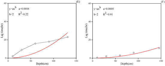 The relationships between the response lag times of water content in the vadose zone and the soil depths for all summer rains leading to water table rising. (A–F) means a precipitation of 17.4 mm, 21.2 mm, 22.4 mm, 30.6 mm, 41.4 mm, and 71.6 mm, respectively.