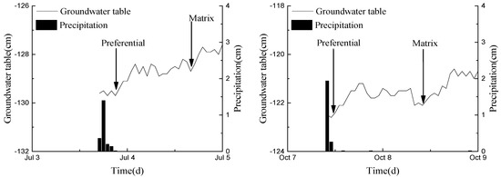 Note that the lag time (obs) at the water table refers to the time interval from the beginning time of precipitation to the beginning time of the observed water table rising in the test site, which is significantly smaller than the calculated results of the model; even less than the lag time at depth of 60 cm in the vadose zone. This result is relevant to a similar studies in the USA and England [44,47]. This may be due to the preferential flow channels in the site (not at the monitoring point); then the response time of the water table was very short, greatly ahead of the lag time in the vadose zone. Two field-measured water table series are plotted in Figure 12. Two different independent water table rising periods are clearly following rainfall while the rainfalls themselves are continuous. The first water table response may be the preferential flow and the second one is the matrix flow. The first response is the start of water table rising in field and the second is the following matrix flow. The response lag times of the matrix flow are 24 h on 3 July and 26 h on 7 October, respectively, corresponding to the modeled response lag times of groundwater recharge. According to Lee [44], this secondary response was more often in wetter seasons in which fissures can fill with water. Similar to Lee’s results, the secondary lagging often follows heavy and intense rainfalls in wetter periods. Only this time the root channels the preferential channel are rather than fissures.