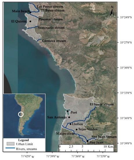 Location of El Quisco and San Antonio. Rivers and streams are presented in blue lines.