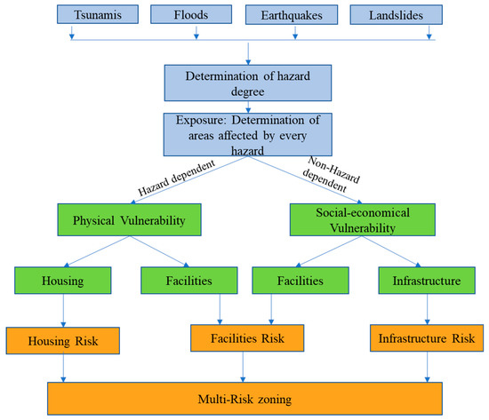 Scheme of the multi-risk assessment methodology. The hazard risk is calculated for each hazard independently, and the overlapping of all the hazards risk determines the multi-risk zoning.