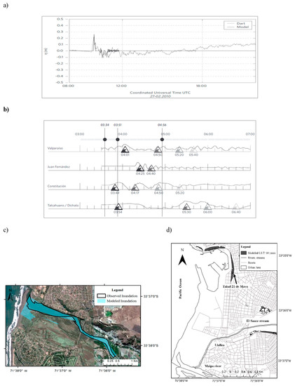 The regional tsunami model is validated by the [65] study using the observations of the 27 February 2010 tsunami. The far-field wave simulated by the SWAN model were compared to the DART (Deep-ocean Assessment and Reporting of Tsunamis) buoy measures located in the coast of Perú (Figure 4a). The near-field waves simulated by the SWAN model were validated by comparing the simulated times of arrival of waves to different Chilean coastal cities against observations published in local media (i.e., La Tercera newspaper, 26 March 2010, Figure 4b).