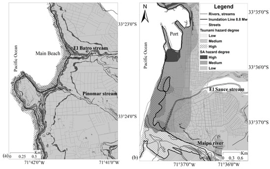 Integrated degree of hazard due to seismic wave amplification (SA) and tsunami inundation at (a) El Quisco and (b) San Antonio.
