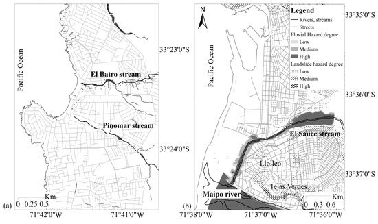 Because its location on the subduction area between the Nazca and the South American plates, several strong tsunamis and earthquakes have occurred in the region [33]. The tsunami of 27 February 2010 [20,34] was particularly destructive and produced severe damages (Figure 2). Furthermore, both cities have developed along the coastal floodplains and near rivers or streams, which enhances the risk to floods and landslide events. Because El Quisco is crossed by five ephemeral creeks (i.e., Las Petras, El Batro, Pinomar, Seminario, and Córdova), there are areas in the city prone to be affected by floods and landslides (Figure 1). On the other hand, San Antonio is crossed by Maipo River and El Sauce stream, and limits to the south with the San Juan stream. According to the [23] report, several fluvial floods and landslide events have affected San Antonio precisely because of the proximity of urban areas to these water bodies.