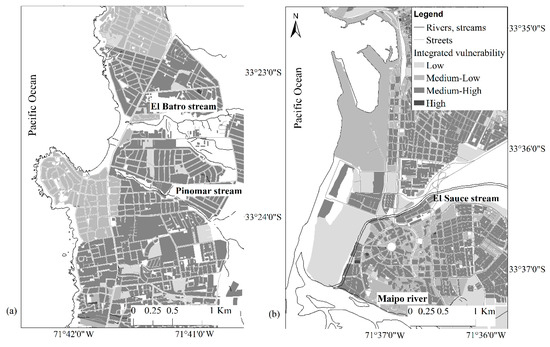 Integrated vulnerability of housing in (a) El Quisco and (b) San Antonio.