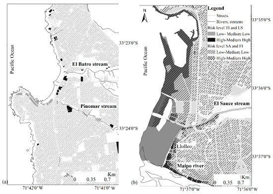 Housing integrated level of risk in (a) El Quisco and (b) San Antonio. The figures consider the Tsunami inundation (TI), landslide (LS), seismic amplification (SA), and fluvial inundation (FI) risk levels.
