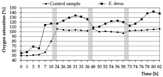 The average percentage of oxygen saturation of wastewater solutions (0, 25, 50, and 100%) with and without (control) E. densa within 3 days of analyzes (periods of nighttime—without measurements—marked as grey zones.