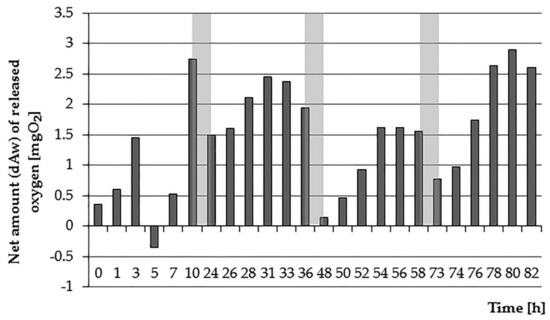Net oxygen amount dAw introduced into the water by E. densa in 4 days of analysis (periods of nighttime—without measurements—marked as grey zones).