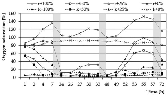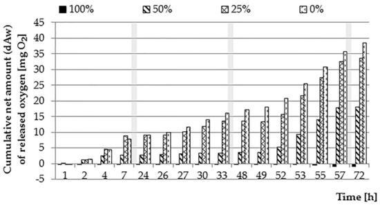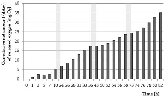 The largest net amount of oxygen equal to 14.23 mg·L−1 plants were introduced on the second day of testing; a similar result was recorded on the last day (13.64 mg·L−1). Lower values were achieved on the first and third day of testing (6.83 mg·L−1 and 8.37 mg·L−1 respectively). Worth noting is also the fact that in the examined vessels, despite the clear influence of the lighting regime, the environment has always been aerobic. This can be explained by the fact that plants release oxygen also in the dark (in the case of an experiment-at night). According to Sand-Jensen et al. [38], the rate of transfer of O2 to water in such conditions is about 10 times slower, but it allows for permanent maintenance of the root surface and rhizosphere in aerobic conditions [41]. The net cumulative amount of oxygen introduced by plants is shown in Figure 3.